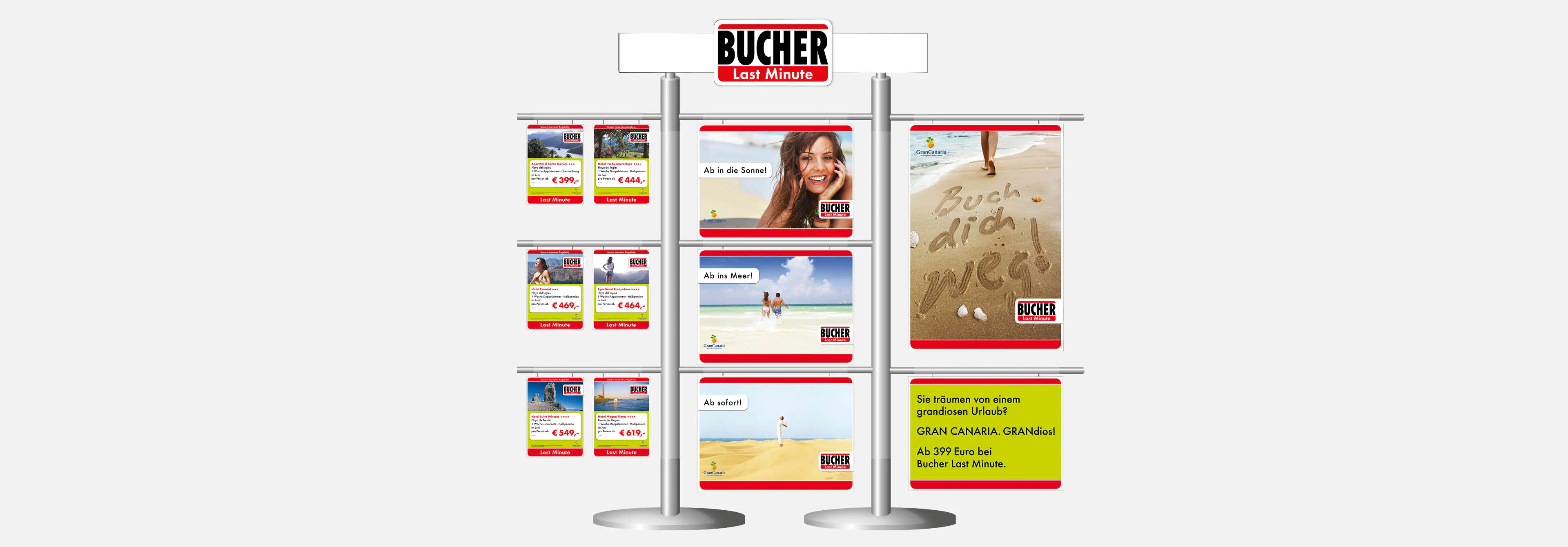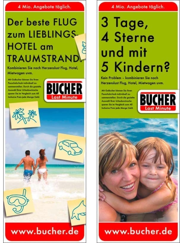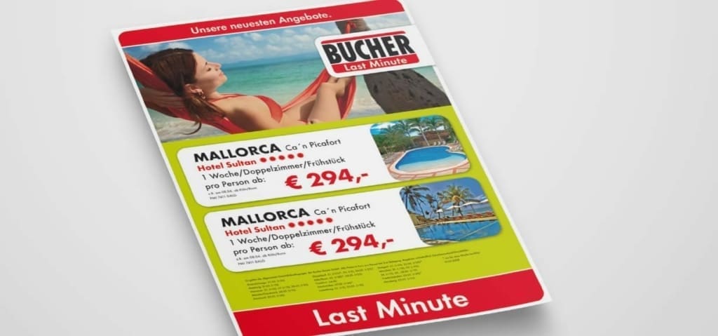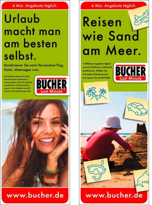Dank ihrer klaren Gestaltung sind unsere Anzeigen und PoS Werbemittel schnell umsetzbar – und damit wie geschaffen für den Last-Minute-Einsatz. So locken wir die Kunden in die Reisebüros, auf bucher.de und in den Süden.