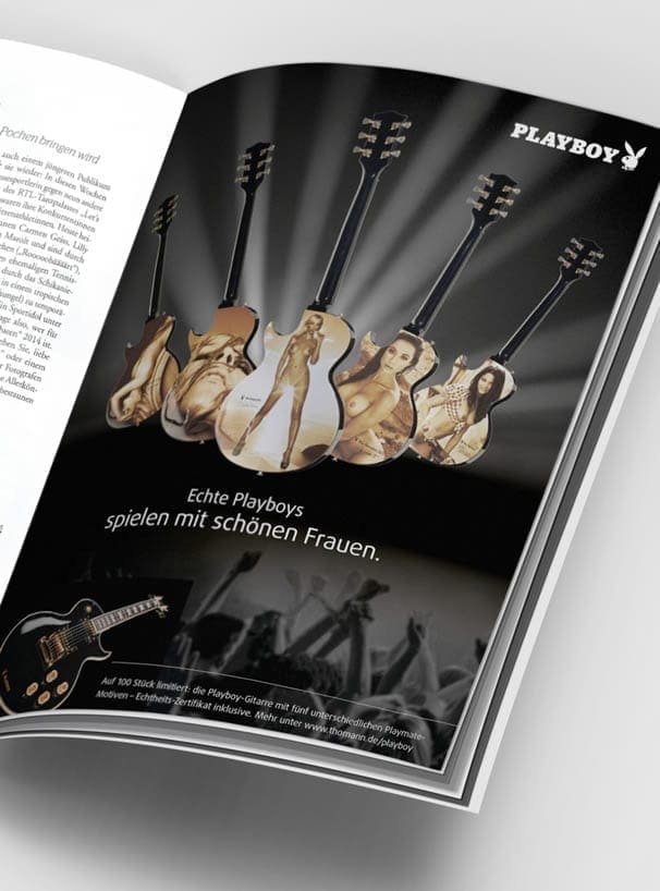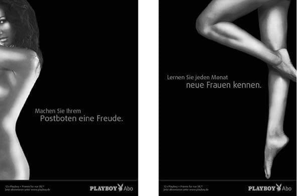 Zur anderen Hälfte übernimmt die Werbung den Vertrieb von kreativen Playboy-Produkten: Zum Beispiel des Life-Time-Abos. Zum Beispiel der Club-Tour. Zum Beispiel der Foto-Workshops. Damit die Marke dabei nicht verloren geht, bekommen alle Werbemittel ein ebenso klares wie einfaches Gestaltungs-Raster. Platingefärbte Bunnies in dezenten Posen schaffen einen hochwertigen Rahmen der ohne weitere Foto-Kosten auskommt.